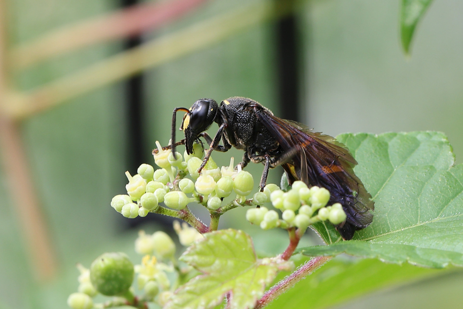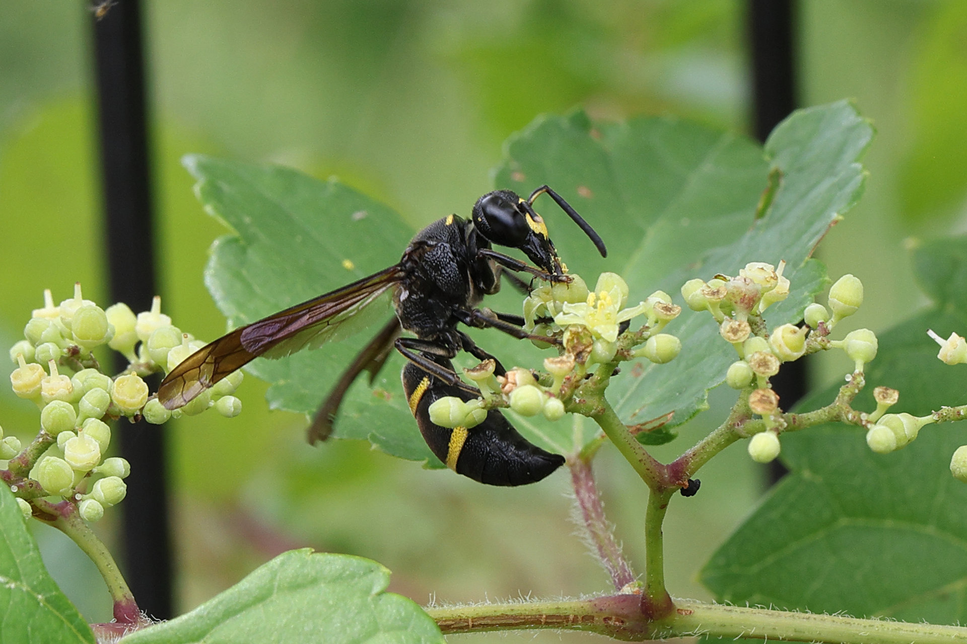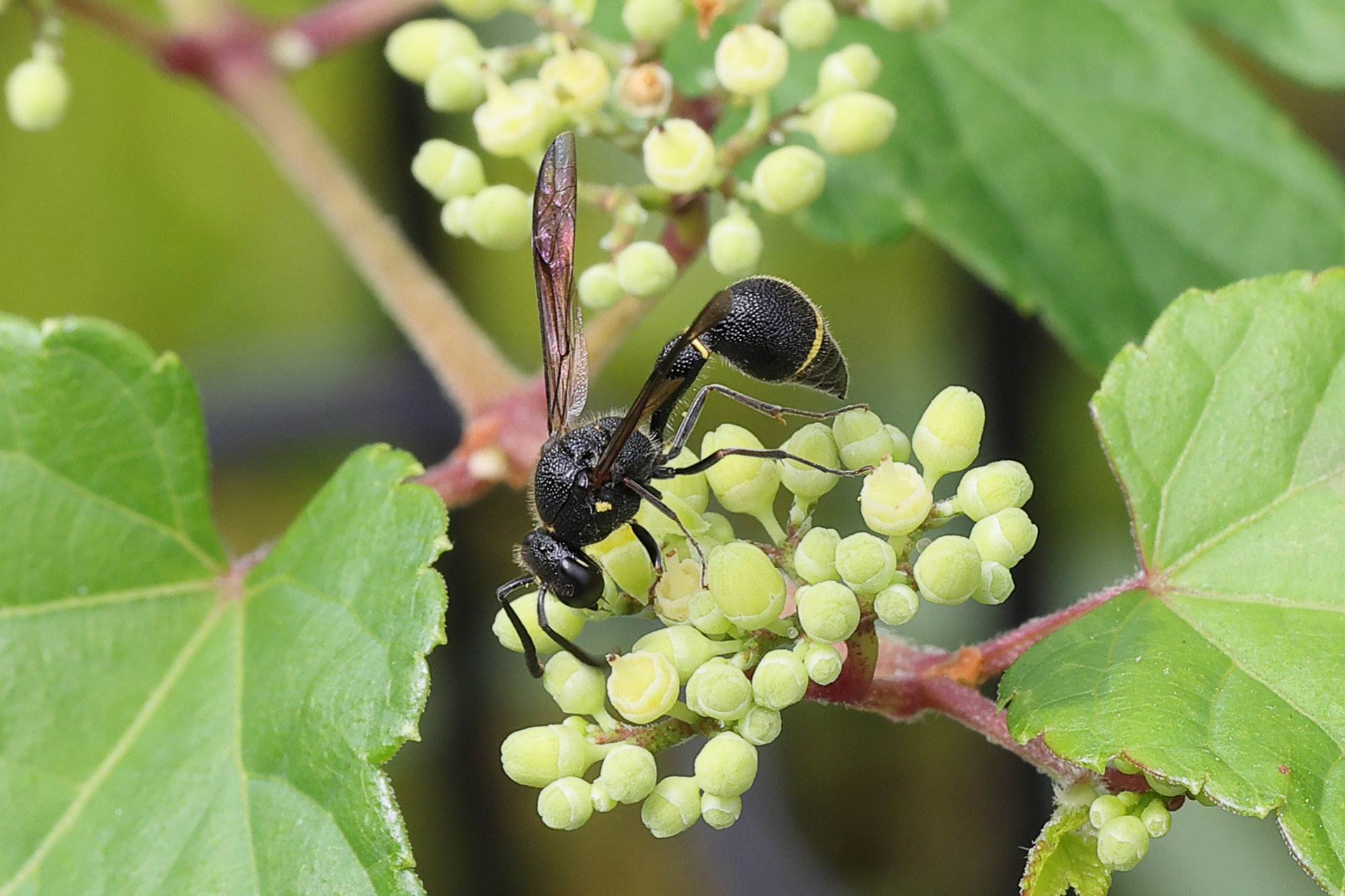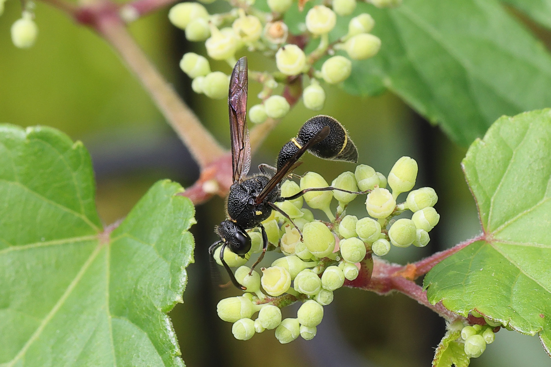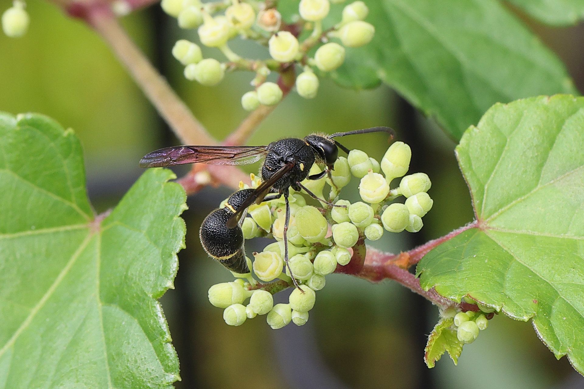 ヤブカラシにオデコフタオビドロバチがきていました